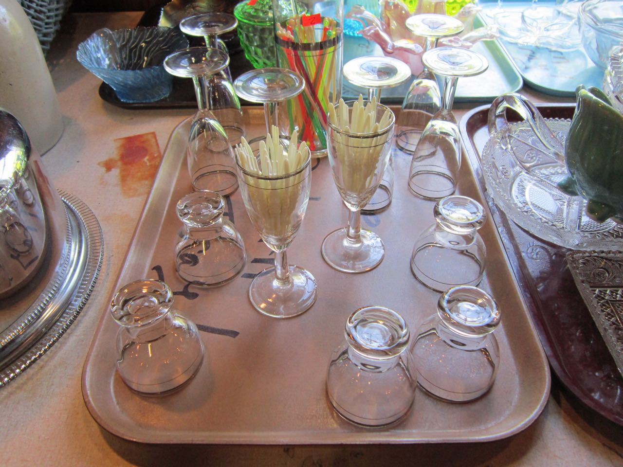 amount of glassware, 1940's kitchenware, flatware, oils, pictures, prints,